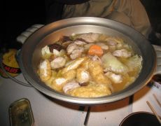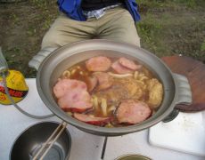 ●前日の食材のうち野菜類が多少余っていたのでメニューは鶏肉の寄せ鍋となった。翌朝は残った出汁にチャーシューと伊勢うどんを入れうどん鍋となる。日本酒の1升紙パック以外はすべて完食・完飲しここを後にする。