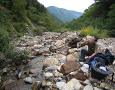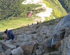 ●名残惜しい中、山頂を後にしテント場へと戻り手際よくテントを片付け、常念乗越から来た道を下山する。しゃぶしゃぶの食材と水も無くなりザックはやや軽くなったが、これまでの足腰の疲労もあることから、2度の休憩を挟み無事にヒエ平登山口に戻る。