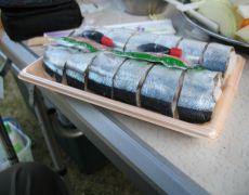 ●百前森山下山後に田辺市本宮町内にて追加の買い出しを行い、本日も時間の関係上温泉に立ち寄らずそのまま野営場へと直行する。途中国道168号沿いのお店で「さんますし」を買う。ここ熊野地方は、このさんますしと高菜の葉を巻いためはりすしが名物であるようだ。