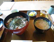 ●お昼前だったがそれほど空腹感がなかったので、第一の目的だった「鰻料理」を食すため、JR新居町駅まで国道1号線沿いを歩く。約30分程歩いた所で「浜名湖料理築地」を見つけここで昼食を取る。メニューはお昼のサービスメニューの「やまかけうなぎ丼」(あさりの味噌汁、香物付き)で大瓶ビールを含めて、料金は2,180円であった。鰻の味は素焼き気味で意外にあっさりとしており美味しくいただいた。