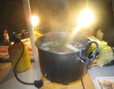 ●今回のメニューは定番の寄せ鍋・カレー鍋で、また2日目の前菜はサンマ寿司を、また酒のアテは刺身と缶詰等を食す。アルコール類は缶ビール350ml12本、日本酒・焼酎(それぞれ紙パック1升)と新宮市街地のスーパーで、円高差益セールで売られていたアメリカカリフォルニア産のワイン1本(580円)であった。なお、帰路のトンカツ定食を含め今回の遠征での総費用は1人あたり15,000円程でいつも同様お安く挙げることができ、また内容も満足できるものであったように思えた。