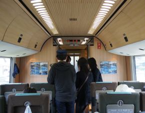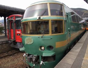 ●車内は 木をふんだんに使ったナチュラルなインテリアの車内で、JR九州ならではの女性乗務員のもてなしを受けながら、沿線の光景を眺め約2時間の列車の旅を満喫する。また、JR由布院駅では1時間程時間があったので、駅付近を散策することもできた。その後は、後発の「特急ゆふいんの森3号」に乗車しJR大分駅へと向かう。