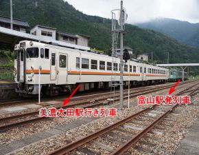 ●このツアー2日目の後半は、この日の最大の目的となった高山本線の全区間乗車となった。前日の飯田線と同様、約4時間の乗車の長丁場となったが、対向電車待ちの停車時には走行する列車を一眼レフでの撮影するなどして無事に全線乗車を果たす。また、道中の車内でご当地の駅弁(ぶりのすし小箱)も食し、旅の目的の全て今回も達成することとなる。