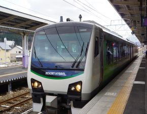 ●使用車両は、日本で初めて営業運転となったディーゼルハイブリッド「HB-E300系気動車2両編成」で、車内ではリゾートアテンダントと呼ばれる客室乗務員が乗務し、観光案内や車内販売等も行っている。