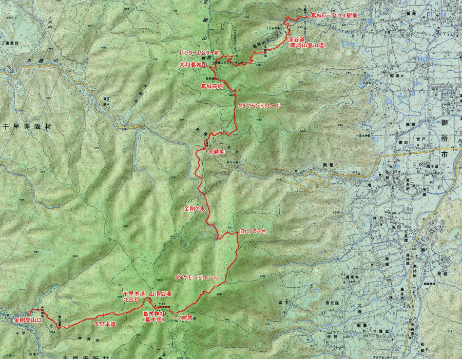 ●3年前の歩行後には、もう二度と歩くことはないと思っていたが、今回訓練ということで再度チャレンジすることとなる。千早本道の連続の上りと、水越峠からの長区間の上り返しによる体力の消耗は覚悟の上だったが、道中全般的に予想以上に順調で、それぞれのポイントをほぼコースタイムどおりに通過する。その結果、当初に予定していた時間より早くに葛城山ロープウェイ駅前に到着する。