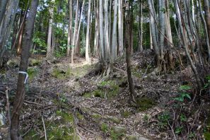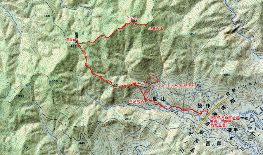 ●この遠征2日目の山行きは、和歌山県の新宮市にある笠丸山に向かうこととなった。この山は前回の遠征で市北部の相賀集落から登頂を目指したが、道中で道に迷い断念した経緯があったので、今回は「分県登山ガイド 和歌山県の山」に紹介のある市南部のJR紀伊佐野駅から塩見峠を経由するルートでの山行きとなる。なお、本に紹介のあったルートは、JR紀伊佐野駅から長く車道の舗装道を歩くこととなっていたので、行程の時間短縮のため那智勝浦新宮道路の橋梁下まで車を走らせ、ここの路肩に駐車し山頂を目指す。