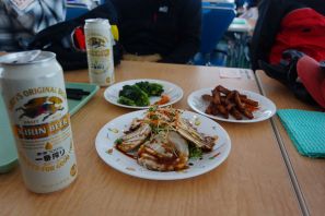 ●午後になっても天候の回復もなく、一日中雪が降る中で途中に大休止を経てこの日は午後4時にゲレンデでの滑走を終え、その後は定宿の「こあらい」に戻り、例年と同様にメンバーと軽く缶ビールで乾杯の後、檜風呂に入浴し身体の疲れを癒やし、お楽しみの夕食に備えることとなる。なお、今年は初日のメニューは和食であった。