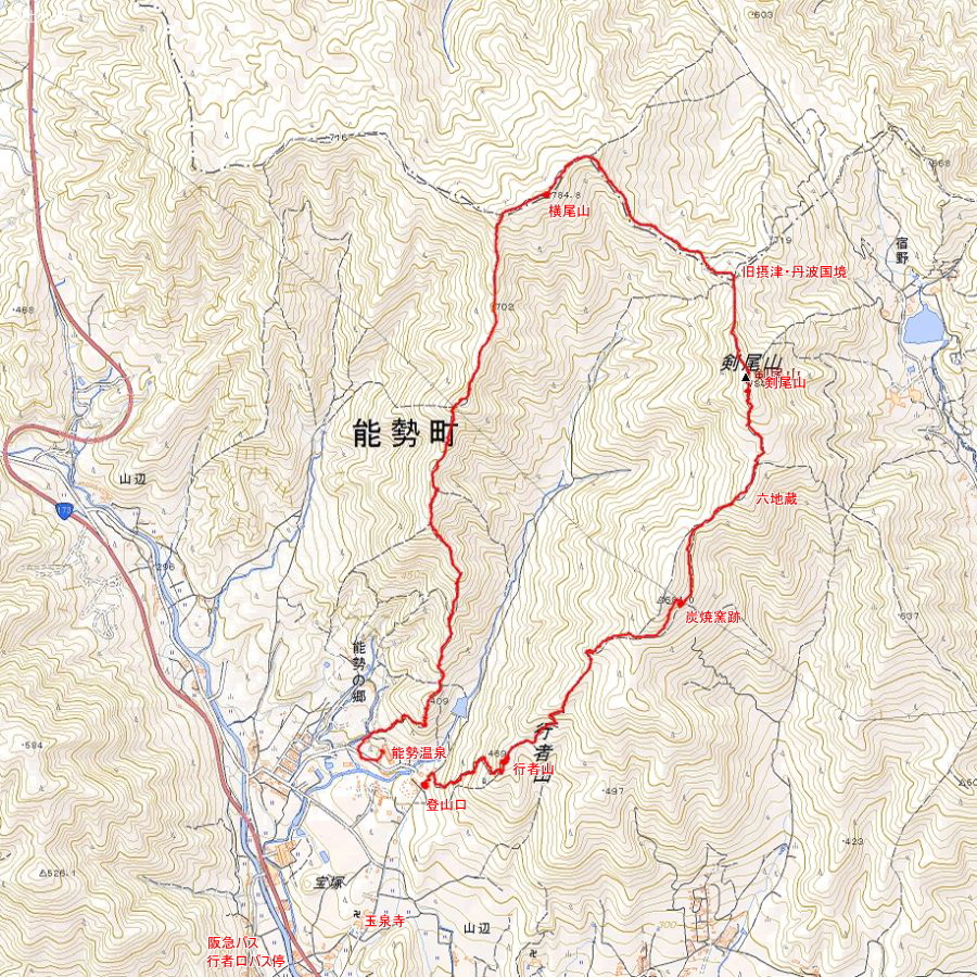 炭焼窯跡 →六地蔵 →剣尾山(784m)(休憩) →旧摂津・丹波国境 →