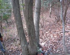 今年も、この時期恒例となっているお連れさんの趣味である?椎茸栽培のお手伝いをしてきました。これまでと同様、原木を調達するためお連れさん所有の里山に入り、木を5本程切ってきました。なお、今回は木を切るだけだったので山行きメンバー3名と愛犬「桃太郎」が参加することとなりました。