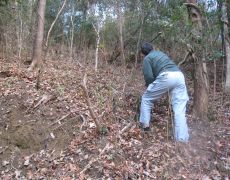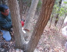 ●小休止の後、いよいよ見つけた木を切るため現地へと向かう。今年は例年と場所が違うので、新たに運搬通路や菌入れする作業場所を確保することから始まったが、昨年新調したチェーンソーのおかげで作業も順調に進み、約1時間ほどで本日の作業を終えることができた。なお、今年は例年より切った木の場所が点在しておらず、後日の運搬作業もスムーズに進みそうだ。