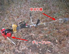 ●今年は、例年の場所には手頃な木がなく辺りを散策することとなった。やがて原木となる木を見つけ一度下山し、チェーンソー等の動作確認を行うため暫し小休止する。