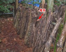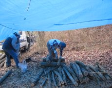 小休止の後、昨年と同様、親方所有の交流発電機付き軽トラックから電源を取り、原木に電気ドリルで穴を開けそこに菌糸を入れる作業に取りかかる。ドリルでの穴開けは親方に任せ、残りのメンバーは親方の補助と菌糸の埋め込みと役割分担し作業を進める。今年は切り出した木が多く、昨年と比べ1.5.倍の3,000個の菌糸を埋め込むこととなる。途中、雨が降り出しブルーシートを張ることとなったが、スムーズに作業は進み予定どおり午前中までに作業を終える。