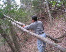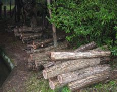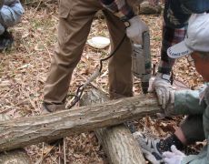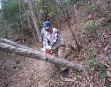 この日は天気予報が思わしくなく、集合時間を30分早めて午前8時に作業を始めることとなった。当方、時間どおりに現地に到着したのだが、既に親方と親分は既に原木の切断作業を始めていた。しかしながら、集合時間を早めようと提案した張本人の運搬隊長がなかなか来ず30分以上も遅刻、どうも前日の歓送迎会での深酒がたたっていたようだ。なお、原木の切断・運搬作業は、昨年と比べ運搬距離は短く運び出しは問題はなかったのだが、原木の切断作業は急勾配であったからか足元も不安定で、結構手間取ったように感じられた。