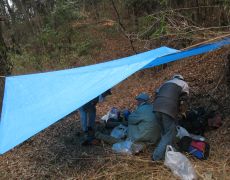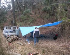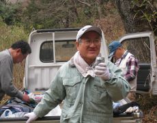 昼からも雨が降り続くとの予報から、反省会前に菌糸を埋め込んだ原木の一部を「椎茸ランド」へと運び出すこととなった。これと並行して作業場所に残ったメンバーで反省会の準備に取りかかる。やがて木の運搬を終えたメンバーも戻り、いつもの反省会が始まる。メニューはここでの定番の「寄せ鍋」で、肉類や魚介類も豊富に用意されており日本酒の熱燗やビールも含め、車の運転でお酒が飲めない親方を尻目に、本日もありがたく頂戴する。反省会も佳境を迎えるも小雨が降り続き、宴を終えるきっかけもなく時間も午後4時を過ぎてしまう。仕方なく雨の中で撤収を始める。
