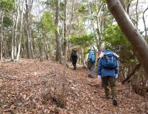 ●今年は、メンバーの1人でリンク仲間「テルさん」が先月に歩いた新ルートでの登頂となり、テルさん以外は初めてのコースであった。このルートは案内看板もなく先客の踏み跡も少ないコースであったが、道に迷うこともなく妙見展望稜線コースとの分岐まで問題もなく歩くことができた。しかしながら、食材等が入った思いザックを背負いながら、444.1mのピークからしばらく下りが続いたことが想定外であったようだ。
