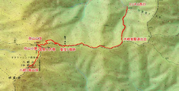 行者還トンネル西口→大峰奥駆道出合(休憩)→聖宝ノ宿跡(休憩)→弥山山頂(休憩)→