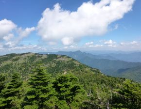 ●当方、久しぶりの山行きながら登り始めからいきなりの急登で早々に体力を消耗することとなったが、道中は心地よい風も吹き暑さも凌げたことから、弥山と八経ヶ岳の山頂にはメンバーの足手惑いになることなく無事にたどり着く。また、山頂付近は近畿地方の最高峰でかつ天候にも恵まれたことから、付近の近畿・関西百名山である大普賢岳や日本百名山の大台ヶ原山の眺望も楽しむことができた。また、先日購入したデジタルカメラ2台の撮影検証も、慌ただしい中ではあったが何とかこなすこともできた。