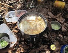 ●予定した作業も全て終えその後はいつもの反省会に突入となる。今年は作業を始めてからは天候にも恵まれたことから?、自宅を出発したときと比べると寒さはそれ程きつくなかったようだ。なお、今回のメニューはちゃんこ鍋の素をベースとした定番の寄せ鍋でいつもながらに美味しくいただいた。