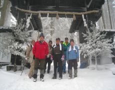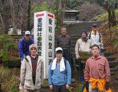 ●登り始めからメンバーの歩行ペースがバラバラで編隊は縦長の状態となる。当初の予定どおり茶屋跡(三合目休憩所)と七合目休憩所で小休止する。今年は登山道に雪が多く、七合目休憩所で早めにアイゼンを装着する。ここからペースはやや遅くなったが、大きく遅れることもなく愛宕神社境内に到着し、いつものように参拝を済ませる。
