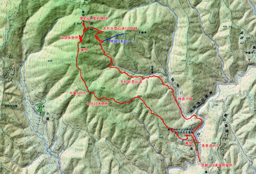水尾分かれ → 七合目休憩所(休憩) →愛宕表参道の鳥居 → 京都バス清滝停留所