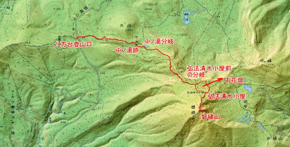 八方台登山口→中ノ湯跡(休憩)→弘法清水小屋前の分岐(休憩)→弘法清水小屋(休憩)→