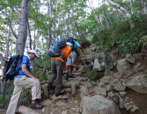●このコースは、先に述べたとおり標高差も少なく行程も短かったが、コース中盤の中ノ湯跡を過ぎた辺りと弘法清水小屋から山頂までに急登の連続があり、また、何時もながらの寝不足がたたり、当方山頂に到着したときには疲労困憊の状態であった。しかしながら、この日はやや暑かったが天気に恵まれ山頂等では彼方の眺望を楽しむことができたことから、遠征の初日は当方にとって満足できる内容だったようだ。