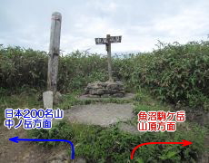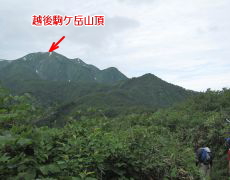 ●小倉山のポイントを過ぎた辺りから二日酔いも収まったのだが、登山道は急登に変わり疲れも癒えぬままの状況が続く。数度の小休止を重ねやっとの思いで駒の小屋を経て山頂に到着する。なお、山頂はやや雲は多めだったが視界も良好で、翌日に登頂する予定の平ケ岳の眺望等を楽しむことができた。ここで昼食を取ながら1時間弱大休止し下山に備える。