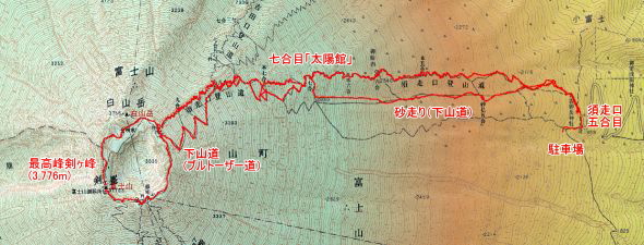 (お鉢めぐり)→富士山剣ヶ峰(3,776m)→(お鉢めぐり)→須走口下山道分岐→
