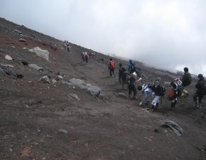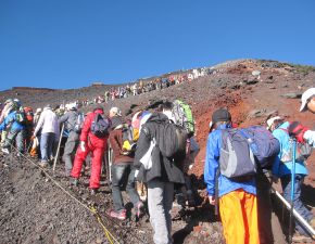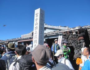●本八合目を越え吉田ルートと合流したことから、登山道は山頂の浅間大社奥宮までの間渋滞が続くこととなる。当方、疲れと息切れが続き、歩行のペースがかなり遅くなっていたので丁度良かったかも知れなかったが、九合目辺りからは渋滞も激しくなり所々で立ち止まることが多くなる。結局、山の地図では通常九合目から山頂の「浅間大社奥宮」までが35分のところが、結果的に1時間以上もかかってしまった。