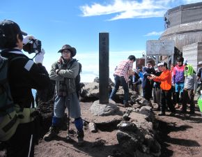 ●山頂の浅間大社奥宮に到着し当方の気力と体力は既に限界に達していたが、天気が良好だったことから、引き続き山頂のお鉢めぐりを行うこととなる。最高峰の剣ヶ峰と旧測候所にある展望台でゆっくりと過ごしたかったのだが、ここでも人が多く最高峰の石標の記念撮影と辺りの山々を眺めただけで早々にここを後にする。