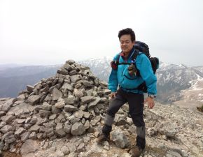 ●林道出合からは勾配のきつい階段状の登山道が続き当方はやや息が上がったが、前日までの遠征の疲れを感じることもなく山頂へ到着する。なお、この日は3日間の遠征の中で一番天候に恵まれていたようで、間近にそびえる氷ノ山の全景を充分に堪能することとなる。しかしながら、山頂付近は風がとても強く、山頂での滞在も程々に下山となってしまう。なお、昼食は残念ではあったが下山後の林道出合にて昼食を取ることとなる。