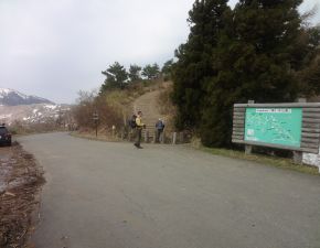 ●宿泊地での撤収を終え車でハチ北高原スキー場ゲレンデ方面へと向かう。なお、登頂はこのゲレンデからと覚悟はしていたのだが、今回はゲレンデ等に残雪がなく、運良く?山の中腹にある林道出合まで車で行くことができたことから、メンバー皆の思惑どおり往復で約1時間の行程での楽チンの山行きとなった。