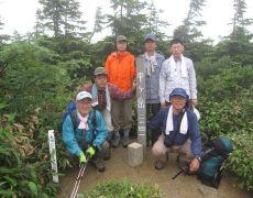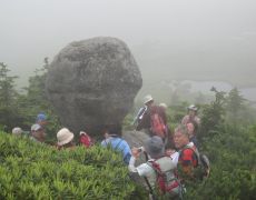 ●風化が進んだ自然の造形奇岩「玉子岩」に立ち寄りその後山頂へと向かう。ここからは前半とは違い勾配も緩く、また、山頂までは木道となっていたので難なく山頂へ向かうこととなる。やがて山頂に到着しメンバー全員で記念撮影を行なったが、山頂は木道から外れたところにあり、また、スペースも殆どなかったのでここで小休止せずそのまま下山の途に着く。