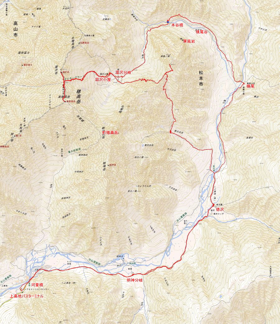 上高地バスターミナル →河童橋 →明神分岐(休憩) →徳沢(休憩) →横尾(休憩) →