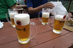 ●当方、上高地はこれまでに訪れたことがなく、歩き始めて暫くは観光気分での山行きとなったが、横尾までは「奥上高地自然散策路」で勾配の緩い道だったので、山の地図にあるコースタイムよりかなり早い歩行のペースとなる。また、横尾からは本格的な登山道となったが、ほぼコースタイムどおりに宿泊地の「涸沢小屋」に到着、早々にウェルカムビールを飲み干すこととなる。なお、この日は降雨はなかったが、風も弱くかなり暑かったので、メンバー皆昼寝などで宿泊地で十分に体の疲れを癒し、翌日の奥穂高岳の登頂に備えることとなる。