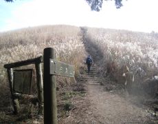 ●山頂に近づくにつれ周りの光景が植林帯からカヤ場の草原に変わる。なお、カヤ場の草原の大きさは約8haもあるらしい。登山道も再び階段状になり息が上がったが、小休止せず一気に岩湧山頂に到着する。