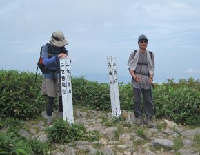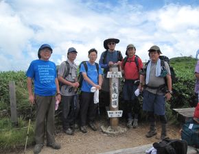 ●山頂で昼食を取り、遠方は雲が多く1〜2年前にこの夏季研修協議会で登頂した山々の全てを確認することはできなかったが、山頂辺りの眺望を充分に満喫する。そのおかげでこの頃には当方の体調も回復し、その後の下山は登ってきた道をそのまま下り問題なく無事に終える。なお、山の地図では、この行程の総コースタイムは8時間45分となっており、甘めに記されていたことが結果的には幸いだったようだが、前日の深酒は避けなければと肝に銘じているところである。