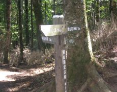 ●三嶺登山口からは、道は林道で勾配は再びなだらかになり、やがて車を止めた名頃駐車場に無事到着する。ほぼ予定した時間に下山することができたので、足早にここから約10km離れた剣山登山リフトの見ノ越駅へ国道439号を経て車で向かい、剣山登頂を目指すこととなる。