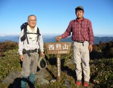 ●おかめ岩避難小屋から西熊山・三嶺までは引き続き高知・徳島県境沿いのササ原に覆われた稜線を歩く。昨夜の宴会での地酒の飲み過ぎでやや二日酔い状況だったが、なだらかな道でまた眺望に恵まれたことから、疲れを感じず縦走することができた。