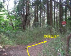 ●大堂越あたりから勾配もややきつくなるのだが、全般的に雑木に覆われそれほど暑さを感じない。途中に小休止も入れずに約1時間弱で妙見山頂に到着する。昨年末の耐寒登山で山頂の三角点をゲットしたが、今回もついつい前回同様三角点まで足を進めることとなった。
