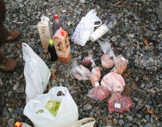 ●主な物 肉(各種)5kg×2袋・キャベツ1玉半・玉ねぎ3個・椎茸数本・缶ビール(350ml×30本)・日本酒1.8リットル(紙パック)×2本・麦焼酎「いいちこ」(900ml紙パック)×1本・赤ワイン720ml×1本・木炭・焼き網など。各自分担してザックに詰め込み山頂へと向かう。
