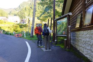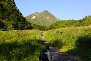 ●この日も山行きの行程が長丁場となることから、夜明け前に幕営地の戸隠キャンプ場での撤収を済まし、この日の最寄り口となる燕温泉バス停まで車で向かう。この山は最寄り口からの標高差は約1,300mで、前日の高妻山と比べややきつく不安が募ったが、燕登山道の温泉源泉管理小屋までは比較的に勾配が緩やかであったため、難なくここに到着する。
