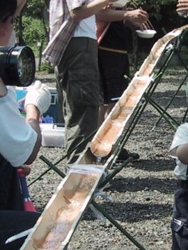 下流部には、取り残した素麺を受けるため、ポリバケツ(ゴミ箱?)及びザルを用意する。