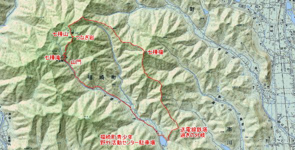 野外活動センター駐車場→山門→七種滝(休憩)→七種山(683m)つなぎ岩(休憩)→