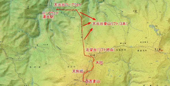ロープウェイ湯元駅→北望台(リフト終点)→大凹(水場)→天狗岩(休憩)→
