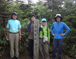 ●リフト終点の北望台から山頂までのコースタイムは片道約95分で、また標高差は約220m程となっているが、細かなアップダウンがあり遠征の最終日には十分な内容であったようだ。この日も天気が心配されたが道中に降雨はなく、山頂の手前の天狗岩では吾妻連峰の眺望を十分に楽しむことができた。ただし山の地図に記載されていたとおり、山頂では辺りの眺望は全くなく記念撮影のみでここを後にする。