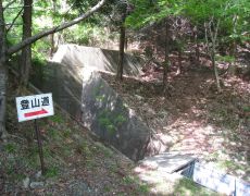 ●篠山市街地から国道176号を北上し鐘ケ坂トンネル入口前のやや広い路肩に車を止め、そこから南へ約5分程歩き金山登山道入口に到着する。ここから金山頂(城趾)標高537mまでは約50分登山道を歩くこととなり、山行きを兼ねた城趾散策となる。