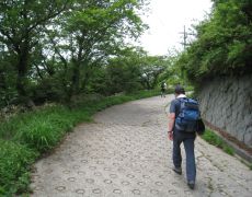 ●ここの六甲全山縦走路は前の魚屋道と同様、木陰の中を進む道だったので直射日光もなく、また、適度にそよ風も吹いていたのでそれほど蒸し暑さを感じなかった。しかしながらアップダウンが続いたことと久しぶりの長距離歩行となったため、塩尾寺に到着したときはバテバテとなりここでやや長めの小休止を入れることとなる。その後は、急勾配の道を下り紅葉ガ丘並びに月見山の住宅地内を経て宝塚温泉に到着する。