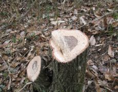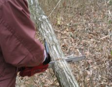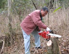 いつもの山行きメンバーも集合し近くの里山へ向かう。2年振りとあって進入路は山草に覆われていたので、早速草刈り機にて刈り取る。後日、原木に菌糸を入れ運搬するのに車が必要であるからだ。当方も最初に刈り取り作業を行ったが、慣れていないせいか直ぐに手がしびれ出す。小休止の後に他のメンバーに変わって貰った。山では平行してクヌギの木を伐採するが、こちらは、チェーンソーを新調したせいかスムーズに作業が進められた。木は出来れば太い方が良いのだが、後の運搬のことを考え程々の木5本を伐採する。本来ならここで本日の作業は終了なのだが、思いの外伐採が早く終わったので引き続き伐採したクヌギの木を90cm程度に切る作業を行うこととなった。
