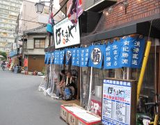 ●天満駅を降り北東徒歩3分の所にお店がある。開店時間は午後4時からでその時間にお店に向かったが、行列で店内に入るはいるのに約15分も掛かってしまった。 ●ここのお店は、南紀勝浦漁港直送のマグロのメニューが売りのようだ。取り敢えず、赤身の刺身・お造りの盛合せ、ビンチョウマグロの小カブト焼き等を注文する。流石に希少な生マグロであってか、値段は各品共そこそこしていたようだ。 ●なお、飲み物は生ビール以外にも焼酎等も各種揃っており、全品294円(消費税込み)だった。ここで約1時間マグロ料理を堪能し、次のお店へと向かうこととなる。ちなみに、料金は1人あたり2,800円であった。 |